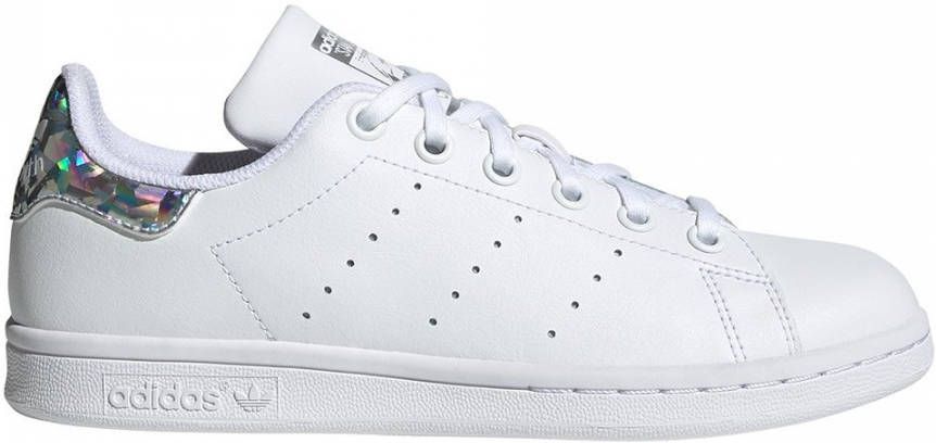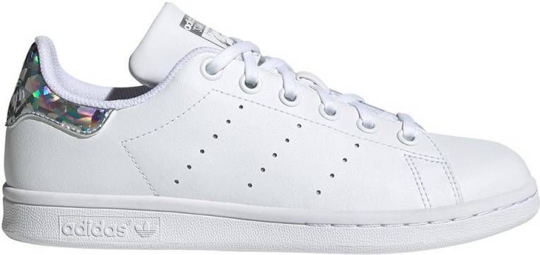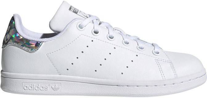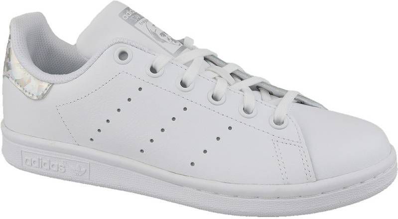 adidas Originals Stan Smith, sneakers voor jongens en meisjes met vetersluiting in de kleur wit. Deze karakteristieke adidas Originals sneakers, zijn gemaakt van getrommeld leer met een metallic hielstuk en komen uit de all season collectie. De sneakers hebben een uitneembare binnenzool. Op de achterkant een print met het Trefoil-logo en de tekst stan smith. Door de geperforeerde 3-Stripes houden de sneakers zn beroemde stijl. De binnenkant is gevoerd met kunstleer en polyester. De rubberen buitenzool heeft een anti-slip laag.
