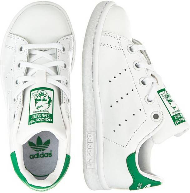 adidas Originals Stan Smith, sneakers met elastische veters voor jongens en meisjes in de kleur wit. Deze leren adidas Originals sneakers, uit de all season collectie, hebben op de achterkant een opdruk met de tekst stan smith. De binnenkant is gevoerd met zachte polyester en de canvas zool heeft een rubberen anti-slip laag. De sneakers hebben vochtafvoerende, uitneembare OrthoLite inlegzooltjes, deze bieden een ademend vermogen en hebben een anti-microbiële werking. Tevens hebben de inlegzooltjes het Adifit-meetsysteem, hiermee kun controleren of de sneakers de juiste maat hebben. Bij deze sneakers worden gewone veters meegeleverd.