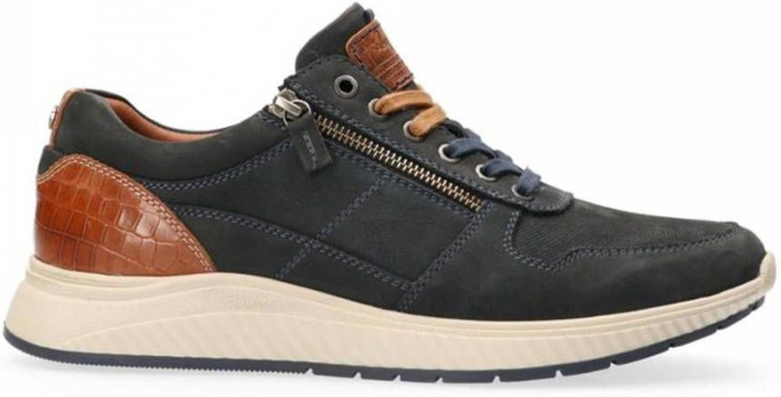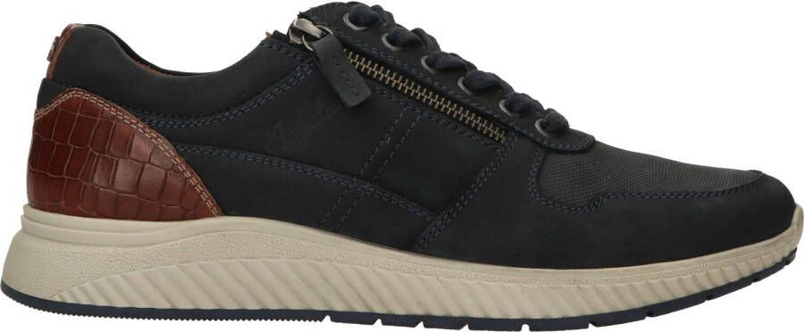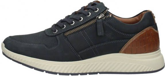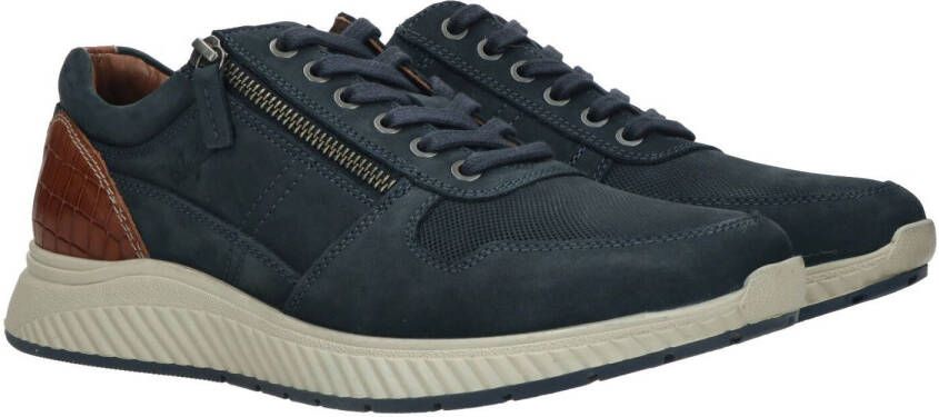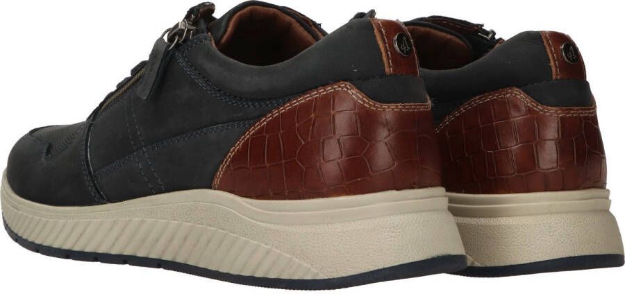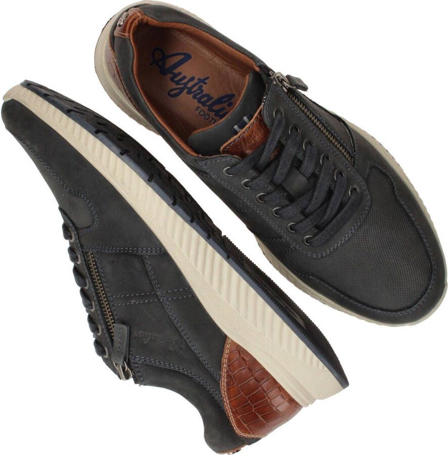 Donkerblauwe sportieve veterschoenen met rits van Australian met cognac details. Deze herenschoenen hebben een bovenwerk gemaakt van leer. Het binnenwerk is gemaakt van een combinatie van leer en textiel. Het voetbed van deze schoenen is uitneembaar. De schoenen hebben een vetersluiting en handige rits aan de zijkant.