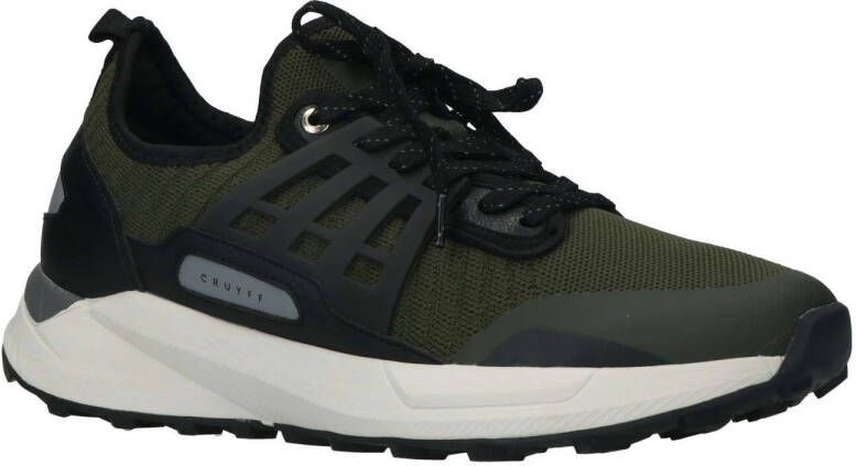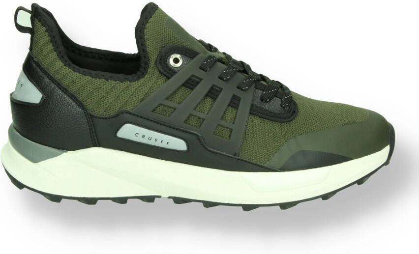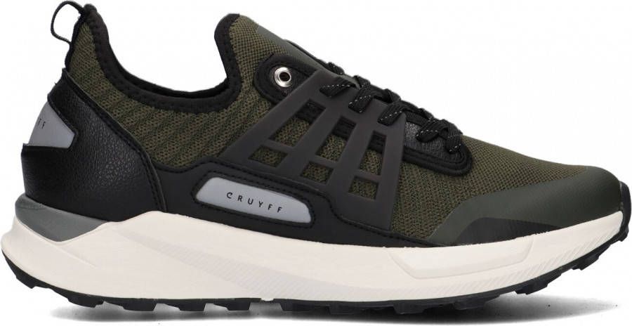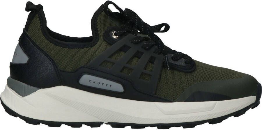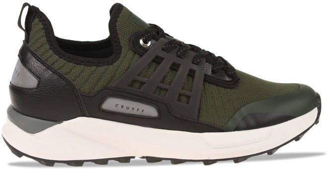 Deze lage sneaker Track Rapid komt uit de schoenencollectie van het sportieve merk Cruyff! De sneaker is gemaakt van mesh textiel, heeft panelen van leatherlook in het zwart en groen en rubberen zijkanten. Leuke details: de twee goudkleurige veterringetjes, de textiele aantreklus, de zwarte enkelrand, de gestructureerde hielstabilisator en het merkembleem aan de zijkant. De binnenkant is gemaakt van textiel en heeft een zacht, uitneembaar voetbed. De chunky zool is gemaakt van rubber en het grijze inzetstuk zorgt voor een finishing touch! De loopzool heeft een driehoekig noppenprofiel en zorgt voor voldoende grip en stabiliteit!.
